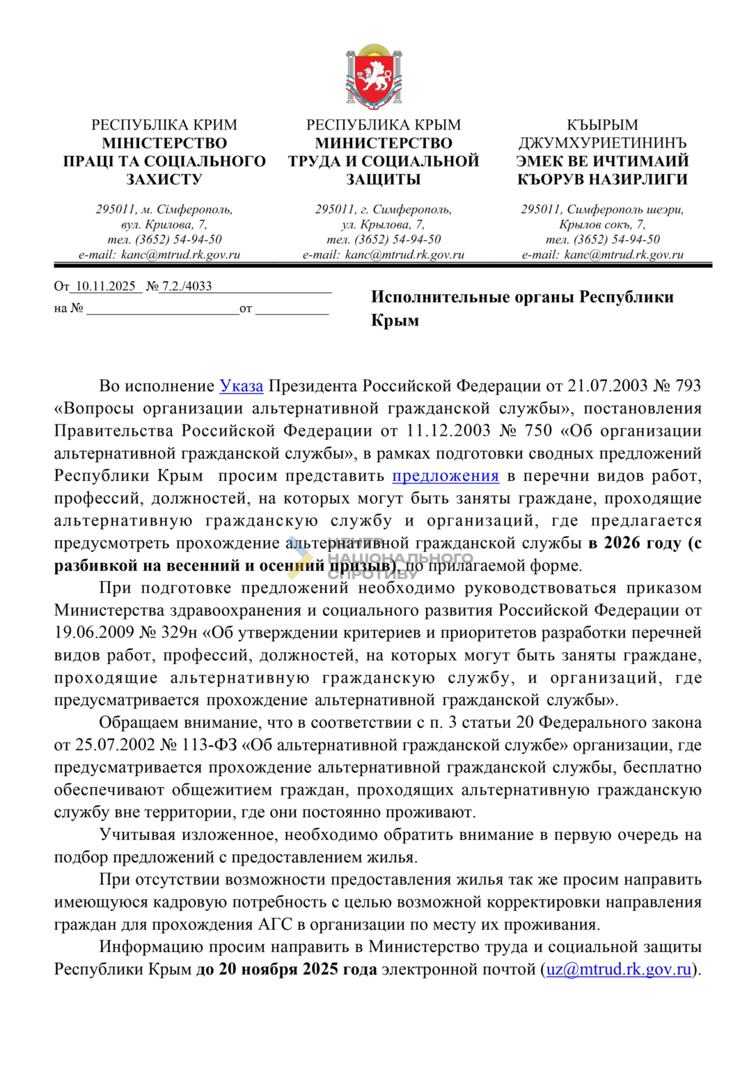 Згідно з листом, інформація мала бути направлена до окупаційного “Міністерства праці та соцзахисту Республіки Крим” до 20 листопада 2025 року.
