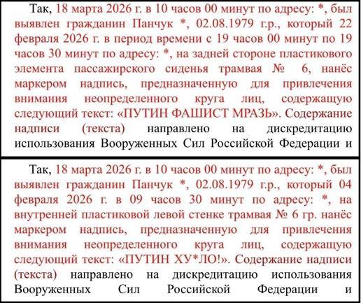 22 лютого 2026 року мешканець Москви В. Панчук написав маркером у трамваї № 6: “Путін — хуйло!” та “Путін — фашист, мерзенник”. Тушинський районний суд визнав В. Панчука винним у “дискредитації” армії та оштрафував його на 60 000 рублів.