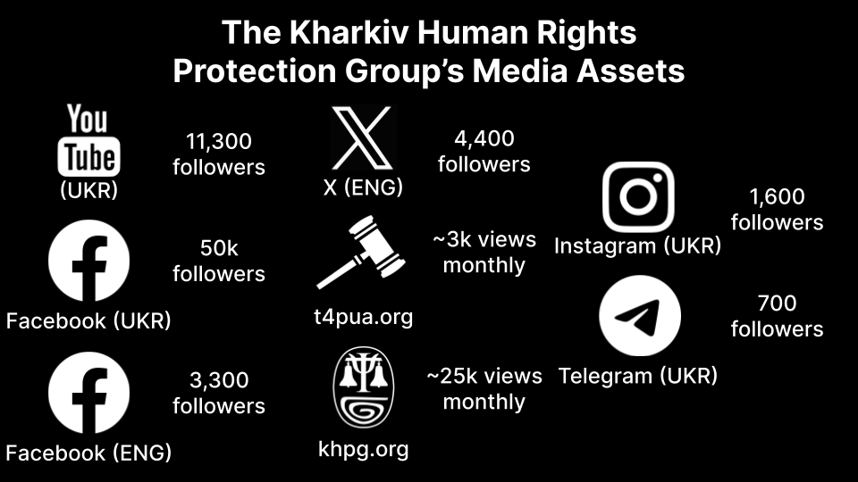 KHPG operates two websites, a YouTube channel and various social media in Ukrainian, English and some other languages.