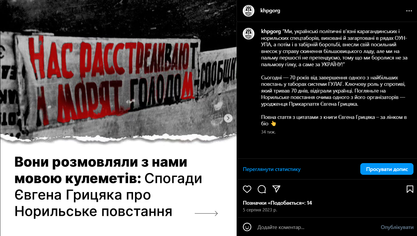 - Вони розмовляли з нами мовою кулеметів: Спогади Євгена Грицяка про Норильське повстання https://khpg.org/1608812589