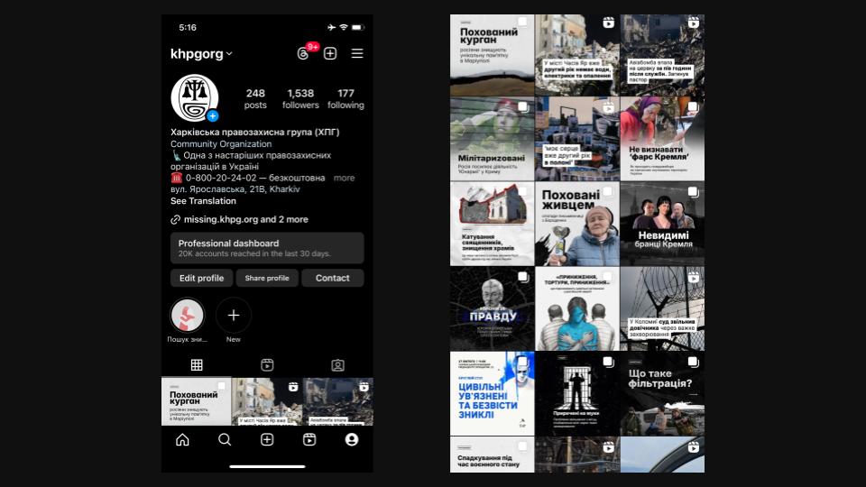 KHPG’s Ukrainian Instagram page has more than 1,600 followers. It is designed in accordance with the modern Instagram standards, embracing such tools as Reels, multiple posts, stories, Instagram Live, multi page joint posts.